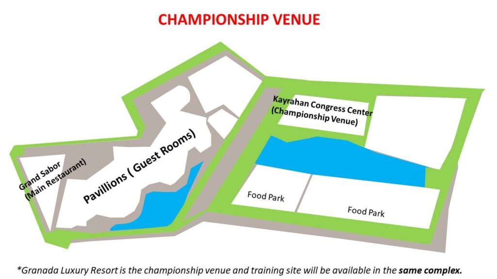 Die gesamte Veranstaltungsfläche befindet sich in günstiger Lage innerhalb des Granada Luxury Hotel Antalya Convention Centers. Die Wettkampfhallen, Aufwärmbereiche, das Anmelde-Schalter und die Unterbringungsmöglichkeiten sind alle im selben Komplex untergebracht. Diese Anordnung ermöglicht es den Athleten und Teams, problemlos zwischen ihren Zimmern, Trainingsbereichen und dem Hauptveranstaltungsbereich zu wechseln, ohne auf Transportmittel angewiesen zu sein. Alles wurde so gestaltet, dass den Teilnehmern eine reibungslose, komfortable und zeiteffiziente Erfahrung geboten wird. Alle wesentlichen Bereiche – einschließlich der Wettkampfhallen, Aufwärmzone, des Anmeldeschalters, der Unterbringungsmöglichkeiten, der Athletenräume und der Essensbereiche – befinden sich im gleichen Komplex und gewährleisten somit maximalen Komfort für alle Teilnehmer.